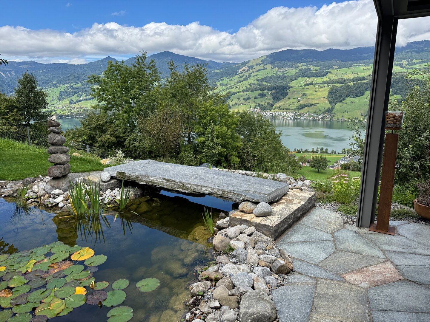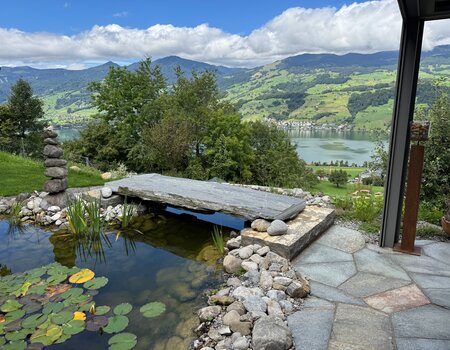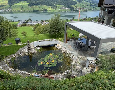 Die bestehende Teichanlage wurde sorgfältig aufgefrischt und durch den Einbau eines Regenwassertanks nachhaltig ergänzt. Neue Akzente setzen zudem Guber-Findlinge sowie ein überarbeitetes Pflanzkonzept mit abwechslungsreichen Blütenzeiten und harmonischen Farbkompositionen, die den Garten über das ganze Jahr hinweg lebendig wirken lassen.