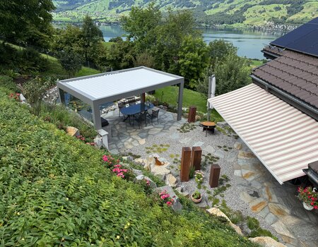 Ein natürliches Baumdach aus sorgfältig ausgewählten Dachbäumen spendet wohltuenden Schatten und fügt sich harmonisch in die Gartenumgebung ein, während es gleichzeitig Struktur und Ruhe bietet. Unter diesem grünen Schirm entfaltet sich eine vielfältige Mischstaudenbepflanzung, die mit einer reichen Farbpalette und blühenden Akzenten das ganze Jahr über Leben in den Garten bringt. Die Sonnenterrasse, eingebettet in das umgebende Grün, lädt zum Entspannen und Geniessen ein. Sie bietet einen ruhigen Rückzugsort mitten in der Natur.