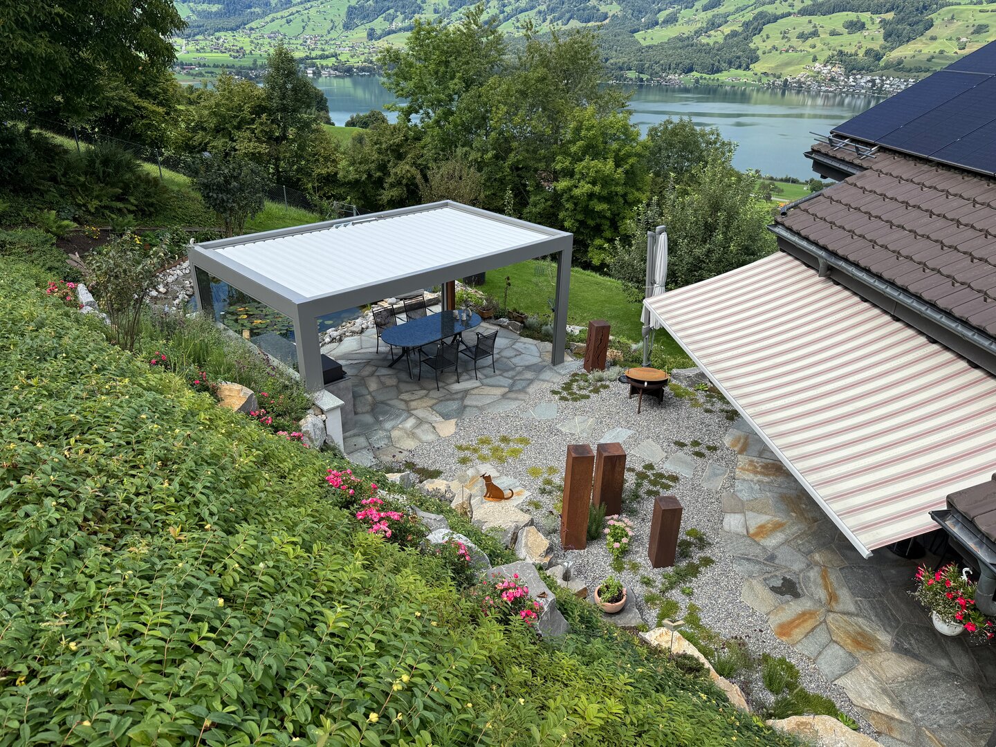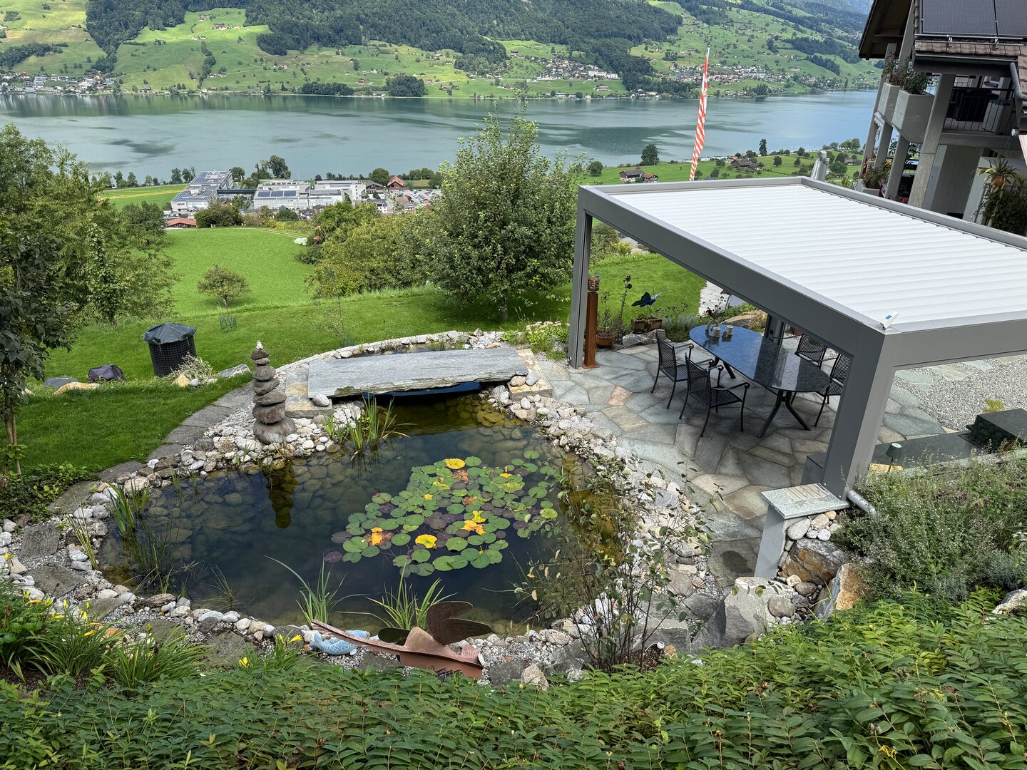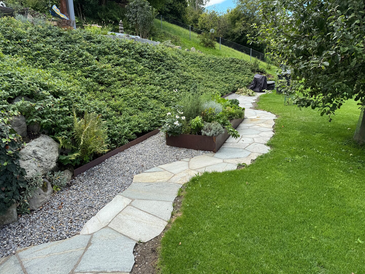 Mit einer sorgfältig abgestimmten Mischung aus einheimischen Stauden und einer artenreichen Blumenwiese ist eine Gartenumgebung entstanden, die Naturverbundenheit und Nachhaltigkeit auf überzeugende Weise vereint. Der eingesetzte Stabilizer-Belag schafft eine feste, aber naturnahe Wegführung, die sich harmonisch in das grüne Gesamtbild einfügt. Altbewährte Elemente treffen hier auf zeitgemässe Akzente – ein Garten, der Tradition und moderne Gestaltung natürlich miteinander verbindet.