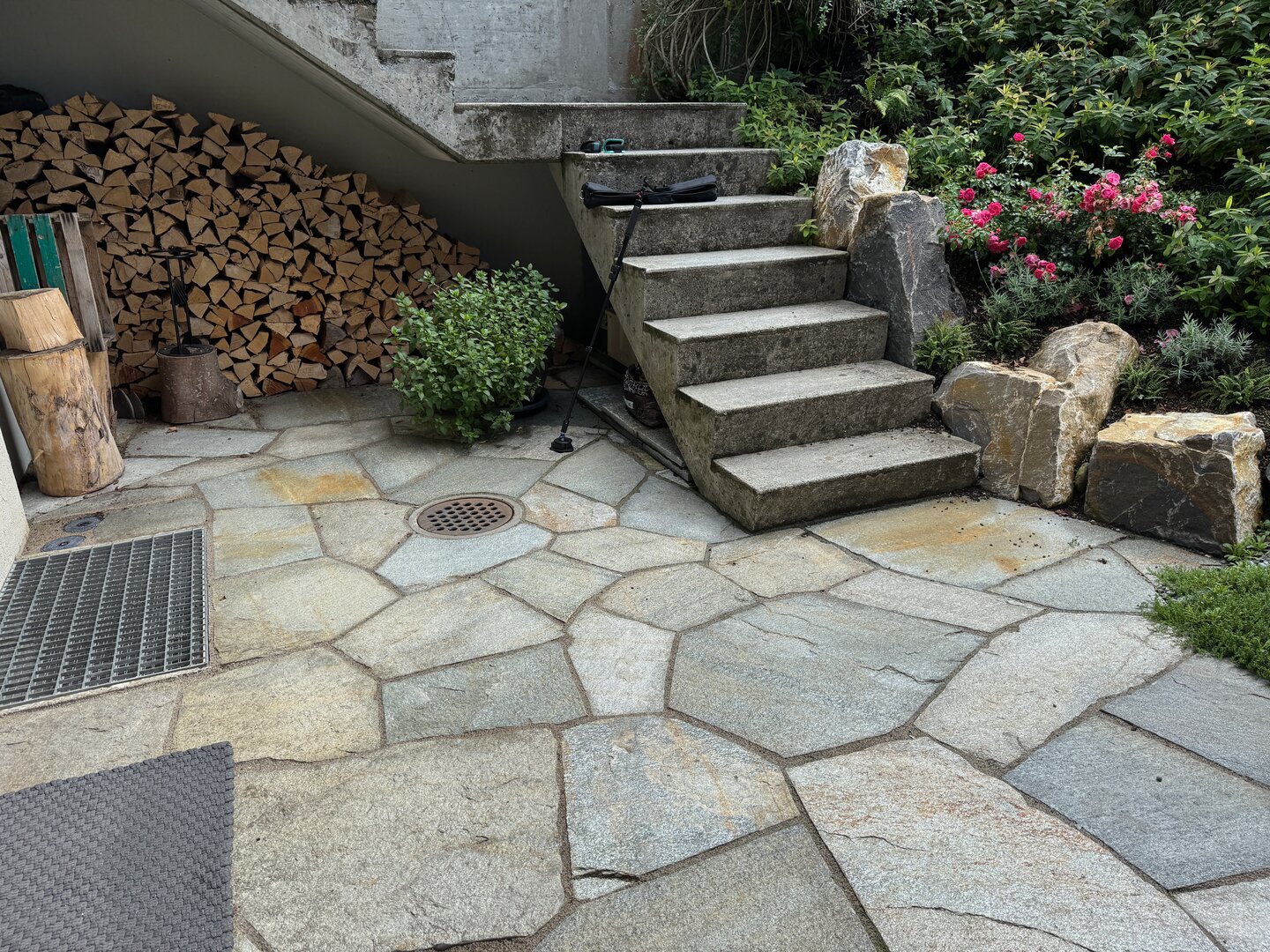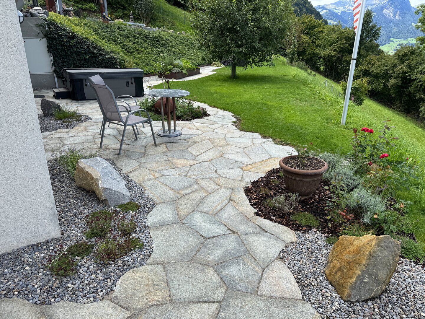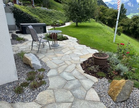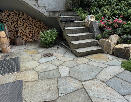 Ein rundum gelungenes Facelifting verwandelte diesen bestehenden Garten in eine moderne und gleichzeitig naturnahe Wohlfühloase. Die bisherigen Plattenbeläge wurden durch natürliche Luserna-Granitplatten im polygonalen Muster ersetzt, während die Terrasse mit bruchrohen Luserna-Platten neu gestaltet wurde und nun eine hochwertige, lebendige Oberfläche bietet.