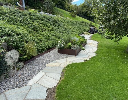 Bei der Umänderung dieses bestehenden Gartens erfolgten die gesamte Beratung und Planung von A bis Z. Neue Treppenanlagen kombiniert mit einem alpinen Steingarten und Steinkörben schaffen dank Natursteinen eine heimische Atmosphäre. Ein komplettes Bepflanzungskonzept sorgt für Farbe im Garten und wird dank einer Bewässerungsanlage automatisch unterhalten. Die notwendigen Vorrichtungen für die passende Gartenbeleuchtung runden die Wohlfühloase ab.